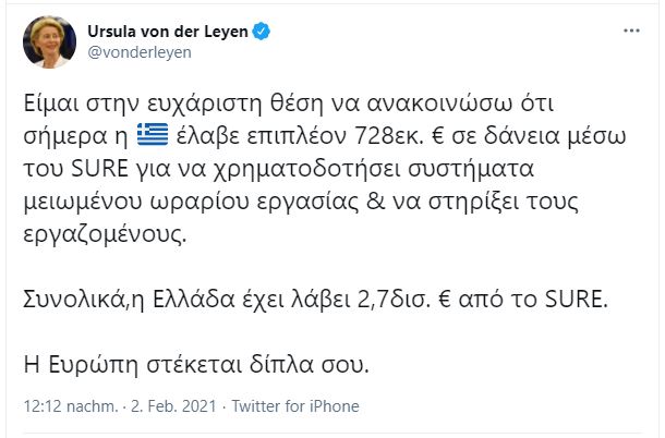 Την εκταμίευση της πρώτης δόσης ύψους 728 εκατομμυρίων εύρω από το πρόγραμμα SURE στην χώρα μας ανακοίνωσε στα ελληνικά μέσω twitter η πρόεδρος της Κομισιόν Ούρσουλα Φον Ντερ Λάιεν.