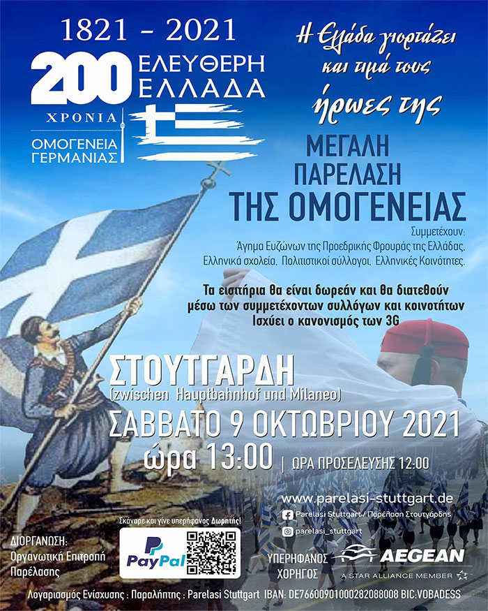 Στο πλαίσιο των εορτασμών για την εθνική επέτειο της 28ης Οκτωβρίου και της συμπλήρωσης 200 ετών από την Ελληνική Επανάσταση, το Σάββατο 9 Οκτωβρίου 2021 θα πραγματοποιηθεί ελληνική παρέλαση στη Στουτγάρδη της Γερμανίας με τη συμμετοχή 59 ομογενειακών φορέων.