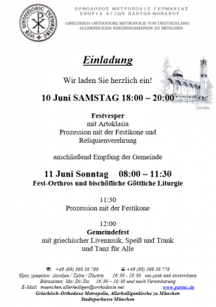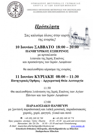 Πρόσκληση της Ενορίας  Αγίων Πάντων Μονάχου σε Πανηγυρικό Εσπερινό, το Σάββατο 10. Ιουνίου 2017 και ώρα 18.00 – 20.00 , καθώς και σε Πανηγυρικό Όρθο, την Κυριακή 11. Ιουνίου 2017 και ώρα 08.00 – 11.30.